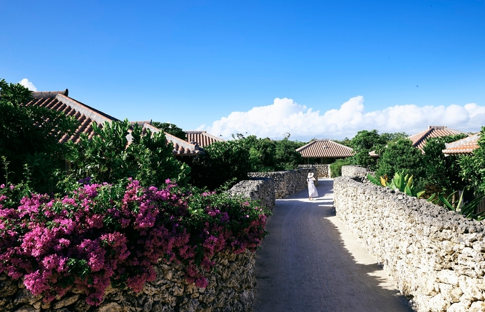 竹富島の東に位置する琉球赤瓦の集落「星のや竹富島」。約2万坪の敷地には、島内の家々と同じように「竹富島景観形成マニュアル」に従い、伝統を尊重して建てた戸建の客室、白砂の路地、プール、見晴台などがあり、小さな集落が構成されています。