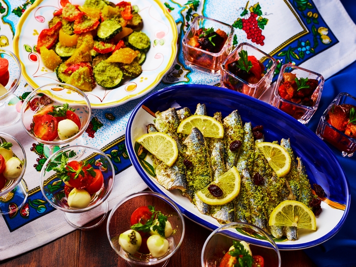 イタリア南部は、イタリア最大の都市「ナポリ」や、地中海の島「シチリア島」があり、季節の彩り豊かな野菜や新鮮な魚介類が豊富です。ヴェルドゥーラ(野菜とチーズのオーブン焼き)や、カポナータ(ナスと玉ネギのトマト煮込み)などのカラフルな前菜を豊富に取り揃え、一匹まるごとオーブンで焼いた「スズキのオーブン焼き アーモンドの香り」、「ズッパ ディ コッツェ」(蒸しムール貝)などの魚介類は白ワインとの相性が抜群です。