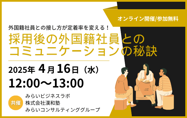 みらいコンサルティンググループ(本社:東京都中央区、代表:久保 光雄 岡田 烈司)は、2025年4月16日にセミナー『採用後の外国籍社員とのコミュニケーションの秘訣』をWEBにて開催します。