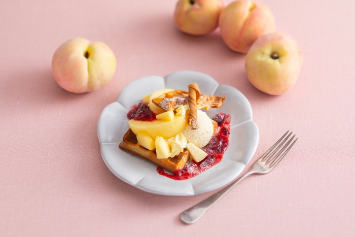 注文いただいてから作る焼きたてのサクふわワッフルに、旬の岡山産白桃をたっぷりと。爽やかな酸味のヨーグルトホイップや、ピーチにミルクのコクを加えたソースやベリーを合わせて、味わいも豊かに。ボリュームもあり、大満足の一皿です。