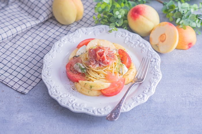 「おかやま白桃とトマトの冷製パスタ 〜生ハム・桃ジュレ添え〜」