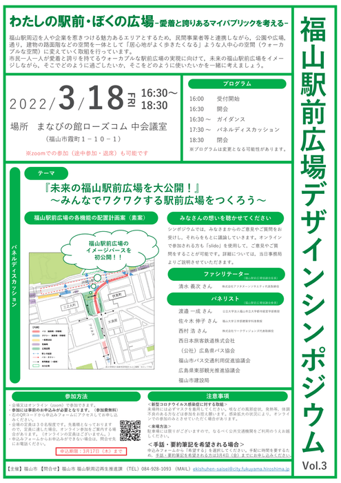 市民一人一人が愛着と誇りを持てるウォーカブルな駅前広場の実現に向けて、未来の駅前広場をイメージしながら、そこでどのように過ごしたいか、そこをどのように使いたいかなど、市民のみなさまの想いを聴く場として、第3回福山駅前広場デザインシンポジウムを開催しますので、お知らせします。