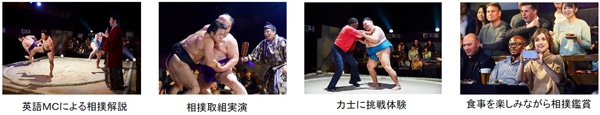 オープニングアクトに続き力士が登場。MC(司会者)による英語での相撲の文化・歴史やルール解説の後、迫力満点の取組やぶつかり稽古等を繰り広げます。パフォーマンスは見るだけではなく、お客様も土俵に上がって稽古や力士に挑戦など実際に体験もできます。