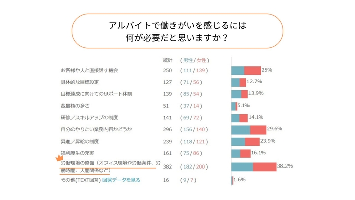 ●アルバイトで働きがいを感じるには「労働環境の整備」「自分のやりたい業務内容かどうか」が大切だという意見が多数寄せられた。