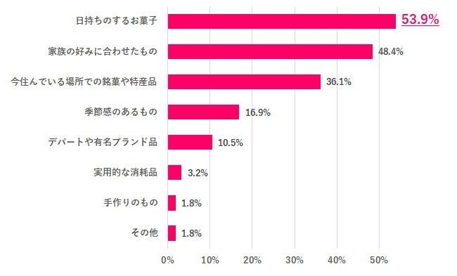 実家に持って帰る手土産の種類について聞いたところ、「日持ちのするお菓子」が53.9%で最も多く選ばれていました。次いで、「家族の好みに合わせたもの」が48.4%、「今住んでいる場所での銘菓や特産品」が36.1%と続きました。その他のコメントとしては、「旅行先のお土産」などがありました。