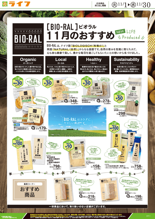 “おいしい” “ワクワク” “ハッピー” をお届けするライフコーポレーションは、健康志向のお客様におすすめしたいBIO-RAL(ビオラル)商品を、毎月お試し価格やポイントプレゼントなどでお得にご提供しております。11月のおすすめは肌寒くなってきたこの時期に食べたいおでんの具に最適な「素材そのままおいしいさつま揚・国産野菜入り」、肉々しい「国産具材でつくった五目焼売」、かけうどんにもピッタリな「国産小麦まるごと全粒粉うどん」などを含む12品です。