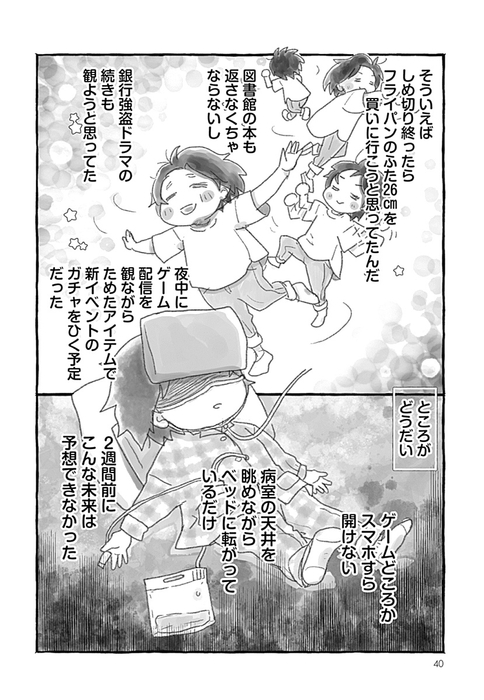 40代半ばのまんが家・林 晴々。これまで入院や手術の経験はなく、まあまあ元気に生きてきました。だけど、その“まあまあ元気”が、やすやすと打ち砕かれる出来事が…! 2021年7月、新型コロナウイルスに夫婦そろって感染していることが判明して―!?