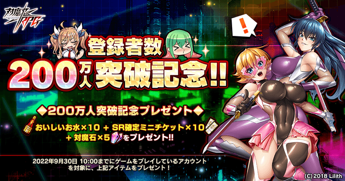 対魔忍RPGの登録者数200万人突破を記念して通常のログインボーナスとは別にアイテムをプレゼントいたします。