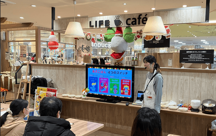 永谷園からは、朝食の大切さについてのお話とお茶づけの試食を行いました。試食の際には、「お茶づけに合うトッピング」を売り場で探し、多数決で選ばれた食材を実際にのせて食べていただきました。