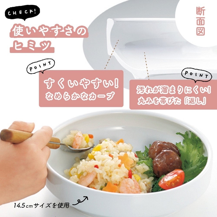 この食器は、内側に返しのあることですくいやすく設計されているため、子どもの「自分で食べたい!」という気持ちを応援してくれます。
