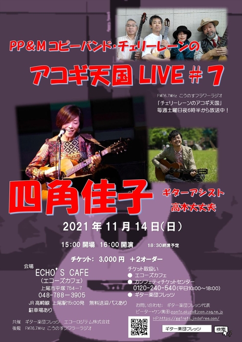 ピーター・ポール&マリーのコピーバンドとして活躍中のチェリーレーンによる「チェリーレーンのアコギ天国LIVE」が2021年11月14日 (日)・2021年12月5日 (日)・2022年1月9日 (日)にエコーズカフェ(埼玉県上尾市)にて開催されます。フォーク界のレジェンド、六文銭のメンバーが毎回ゲストとして出演します。オープニングアクトに舞奈(18)も出演予定。チケットはカンフェティ(運営:ロングランプランニング株式会社、東京都新宿区、代表取締役:榑松 ⼤剛)にて。カンフェティ限定割引チケット発売中です。