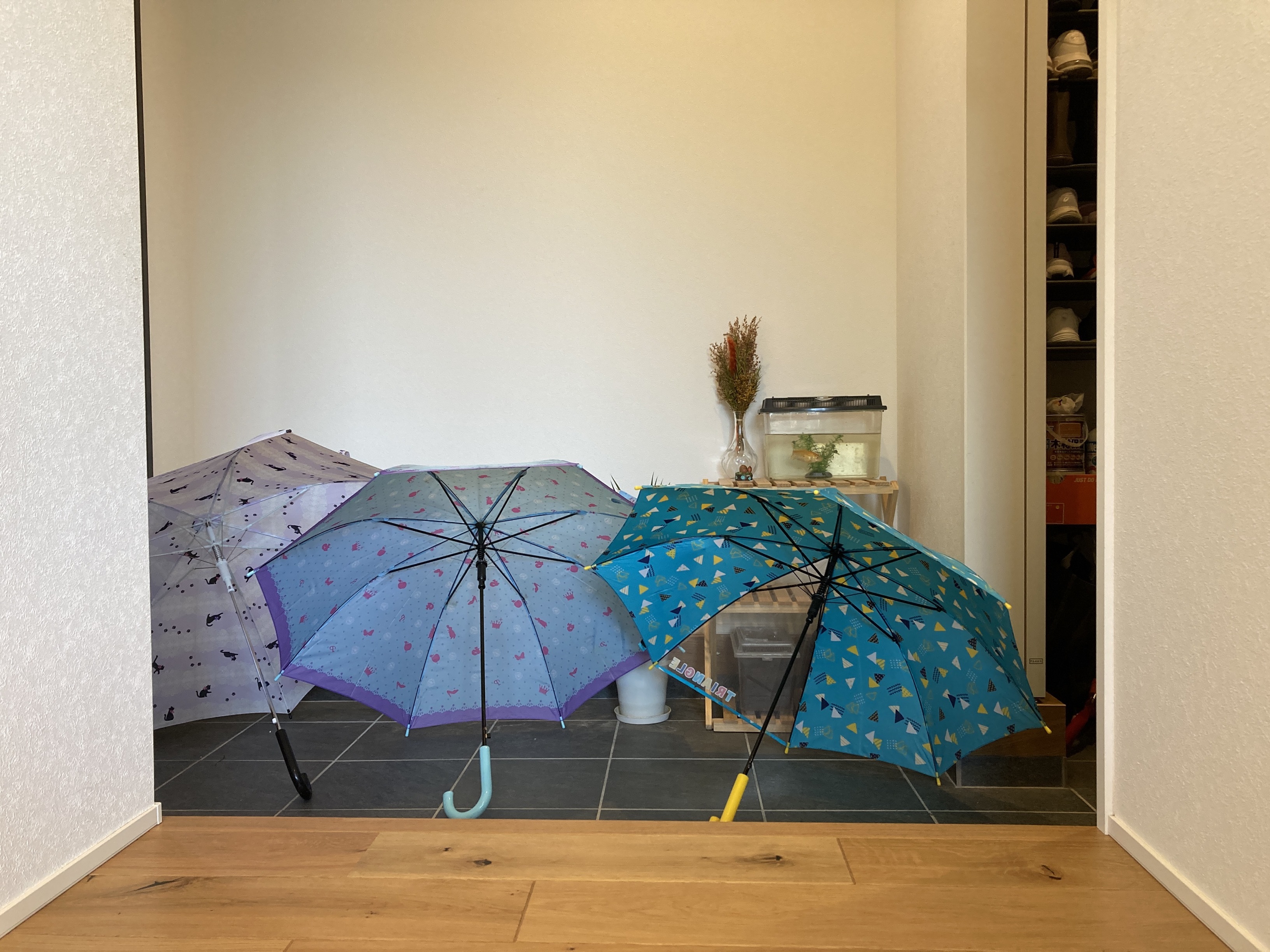 土間スペースに置くものをシューズクロークに収納することで、土間には十分に傘を干すこともできるスペースが確保できます。連日雨の続く梅雨時期でも、夜に広げておけば朝には乾いているため、風で飛ばされる心配もありません。