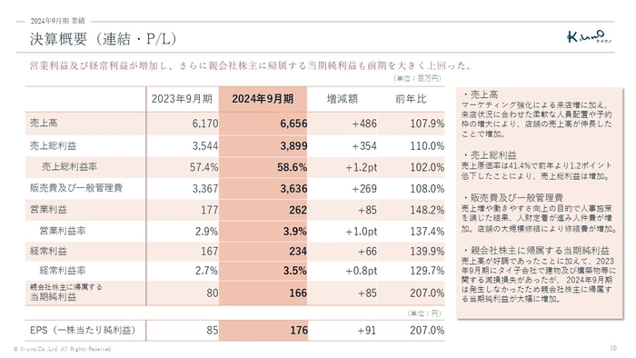 売上高は、店舗の売上高が伸長したことで増加し、前年比107.9%の6,656百万円となりました。売上総利益は、売上原価率が前年より1.2ポイント低下したことにより増加し、前年比110.0%の3,899百万円となりました。販売費及び一般管理費は、売上増や働きやすさ向上の目的で人事施策を講じた結果、人財定着が進み人件費が増加したほか、店舗の大規模修繕により修繕費が増加し、前年比108.0%の3,636百万円となりました。親会社株主に帰属する当期純利益は、売上高が好調であったことに加えて、2023年9月期にタイ子会社で建物及び構築物等に関する減損損失がありましたが 2024年9月期は発生しなかったため大幅に増加し、前年比207.0%の166百万円となりました。