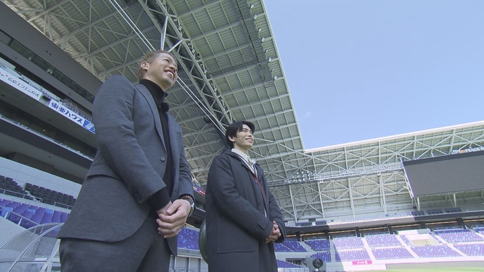 学生時代はサッカー部の副キャプテンを務めたこともある影山さん、スタジアムのコンコースや壁画、ミュージアムなど ”サカスタ7つの平和” に触れ、復興の歴史や平和への願いが込められていることに思いを新たにしていきます。スタジアムのピッチ場では森﨑さんに誘われパス交換!サッカー少年として感動する場面も!