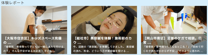 「体験レポート」では、受付~お会計までの流れや実際に施術を体験した方の感想、院内サービスなどを掲載しています。レポートを読むだけでおおまかな流れがイメージでき、施術院に行ったことのない方でも安心です。