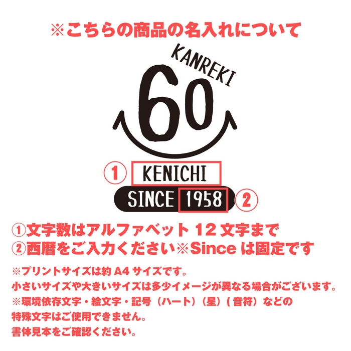 ”スマイル”名入れ還暦Tシャツは、シンプルでありながらもスタイリッシュで、笑顔をテーマにしたデザインが特徴です。おばあさんの名前を入れることで、世界に一つだけの特別なTシャツとなり、還暦のお祝いに最適です。家族の絆を深める素敵な贈り物として、多くの方に喜ばれています。
