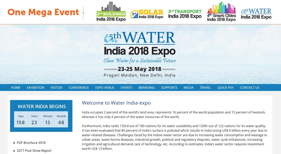 国際展示会 「第5回インド水エキスポ 2018年」(Exhibitions India Group主催)の出展お申込み受付開始