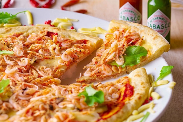 右)桜えびを散りばめた彩り豊かなピザ。桜えびの香ばしさが食欲をそそる、お子様から大人まで楽しめる一品です。