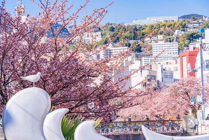 日本で最も早咲きの梅と言われる「熱海梅園」の梅。例年11月下旬から12月上旬に開花が確認されますが、早咲きから遅咲きまで品種が多く開花時期が異なるため、長い期間梅見をお楽しみいただけるのが特徴です。また、熱海では沖縄の寒緋桜と並ぶ日本でもっとも早咲きの桜「あたみ桜」を、市内中心部を流れる糸川沿い約300mの遊歩道の他にも、市内各所で愛でることができます。