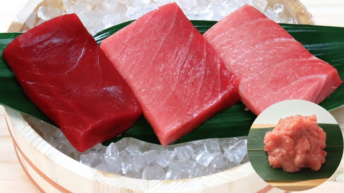 (赤身・中とろ・大とろ柵各150g採れたて中落ち100g付き)