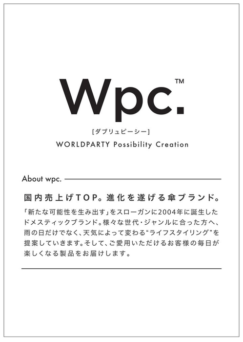 傘ブランドのWpc.™(株式会社ワールドパーティー 代表取締役CEO:中村 俊也)と協力し日差しが強い日にも活躍する遮光・UVカットタイプの晴雨兼用傘を展開する。