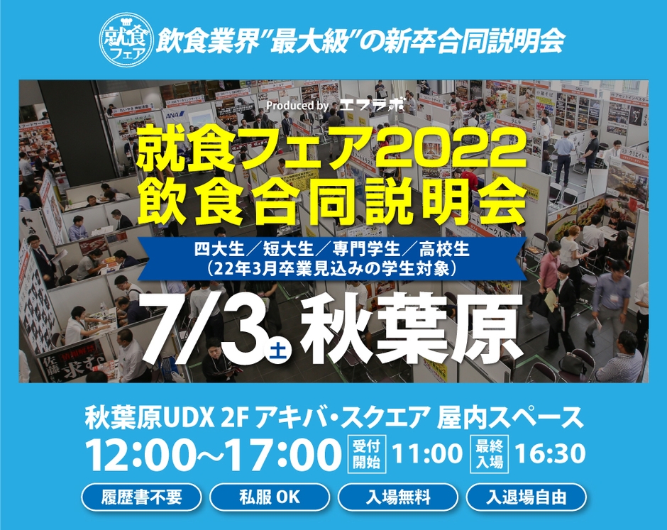 大学生、調理師学生ほか飲食業界就職を考える学生に幅広く利用されている新卒求人サイト「エフラボ」を運営する株式会社ジェイオフィス東京では2022年卒の新卒者を対象とした合同企業説明会を7月3日土曜日に秋葉原で開催します。