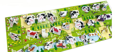 「牧場の朝ヨーグルト」に登場する牛などのキャラクターや、牧場のイラストを組み合わせて、オリジナルの牧場を作って遊ぶことができます。