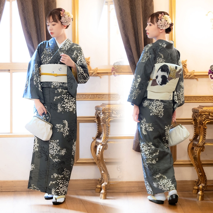 ややグレイッシュな黄みの地に淡いグレーの紗綾形が全体に表現されています。その上に捻じ花や菊、梅などさまざまな花紋が散らされ、鶴が飛ぶデザイン。白に錆朱色や利休茶色、こげ茶色の配色が伝統的な魅力を感じさせます。