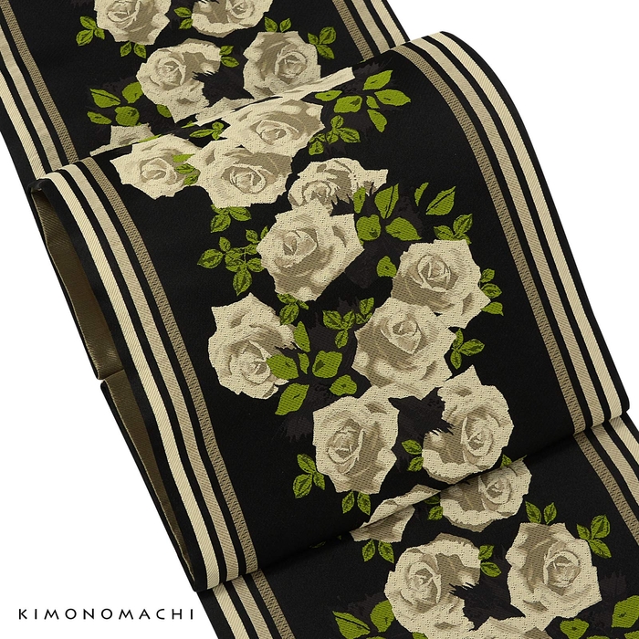 黒地にサンドベージュや浅いカーキ、緑で表現されたバラの文様。浅い黒のシルエットが奥行きを添えています。両端に浅いベージュやカーキの三本縞。ヨーロッパのアンティークリボンのようなシックで上品なデザインです。裏は黒と浅いカーキの太いストライプ。