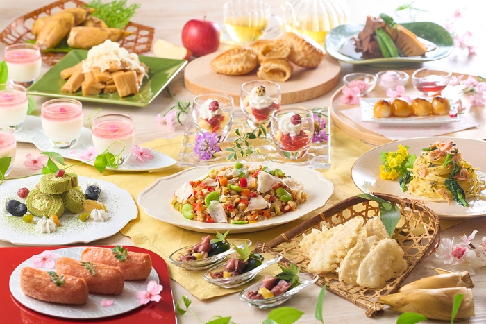 この時期ならではの、春らしい彩り豊かなメニューが並びます。季節の天ぷらは筍をご用意。桜えびの旨みと菜の花のほろ苦い風味、バジルが香る濃厚なクリームソースの相性が抜群の「桜えびと菜の花のクリームパスタ バジル風味」や、カラフルな見た目と食感が楽しい「ツナと小麦の菜園風サラダ」など、目でも舌でも楽しめるメニューが揃います。「桜のクレーマコッタ」や「いちごのトライフル仕立て」など、写真映えするスイーツもおすすめです。