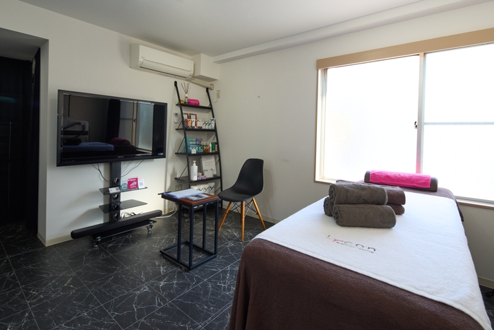 また、内装も男性を意識してます。黒ベースの床にに白い壁ととてもシンプルな内装になっています。男性がお店に入りやすい・行きやすさを重視しているので、豪華絢爛な設備は一切ありません。唯一あるとすると、施術中に見る事の出来る大型テレビと音楽機器、テーブルのみです。そして完全個室・完全プライベートサロンになっているので他の方とバッティングしたり、施術中の会話の内容など聞かれたりすることは一切ないようです。このような男性の視点で見たメンズ専門脱毛店だから男性からの支持が高いんだと感じました。