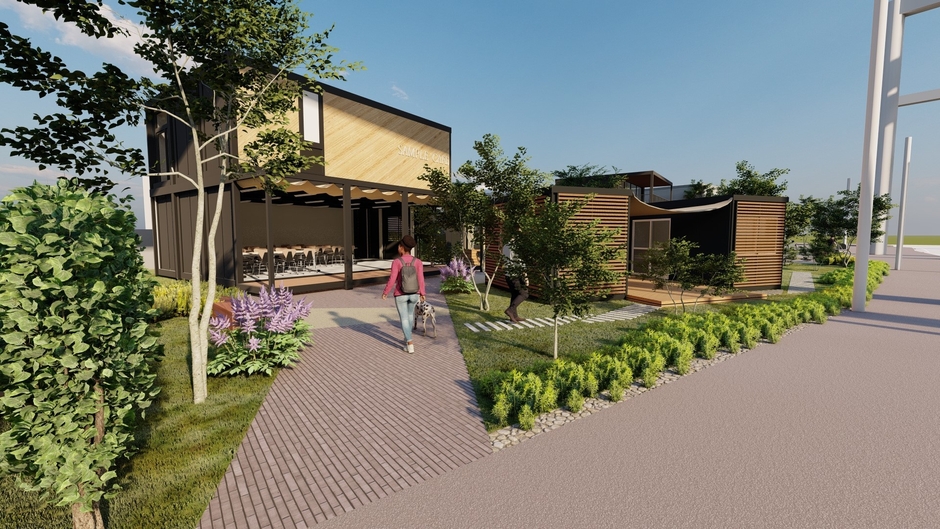 敷地内は通り抜けできる遊歩道のようにしつらえ、散歩や休憩など自由に滞在できる場になるよう設計しました。モバイルスペースに囲まれた滞留空間は、今後地域の皆さまにお楽しみいただけるイベントを企画するなど、地域に開いた場として活用していく予定です。