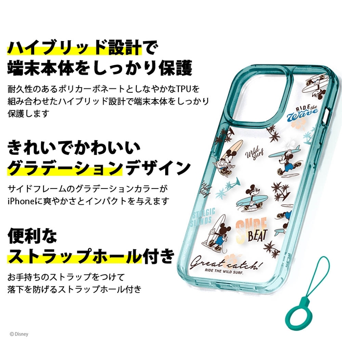 背面はクリアデザインでiPhone本体の美しさを最大限に活かします。耐久性のあるポリカーボネイトとしなやかなTPUを組み合わせたハイブリッド設計で端末本体をしっかり保護します。お手持ちのストラップをつけて落下を防げるストラップホール付き。
