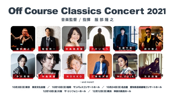 オフコースのデビュー50周年企画として2019年に制作されたアルバム『オフコース・クラシックス』の発売記念コンサートとしてスタートした「オフコース・クラシックス・コンサート」。今年で3年目を迎える2021年には、音楽監督・指揮に服部隆(※)之、またこれまで参加頂きましたシンガーの皆様に加え、新たにたくさんのシンガーの皆様が追加され、更に大変素晴らしいラインナップとなり、オフコースの季節とも言える秋から初冬にかけて全国5都市をツアーすることが決定しています。
