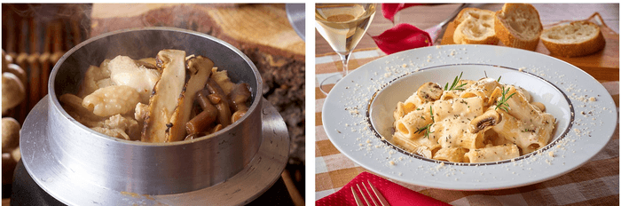 右:洋食メニューも秋らしく、キノコを使ったリガトーニ(ショートパスタの一種)が登場します。ポルチーニやマッシュルームの香り高さと生クリームを使ってリッチに仕上げたホワイトソースがリガトーニによく絡みます。