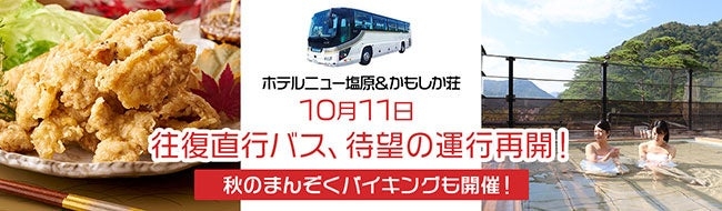 大江戸温泉物語 塩原温泉「ホテルニュー塩原」「かもしか荘」の秋は話題満載。9月1日、秋のまんぞくバイキングスタート!10月11日、待望の「往復直行バス」運行再開!