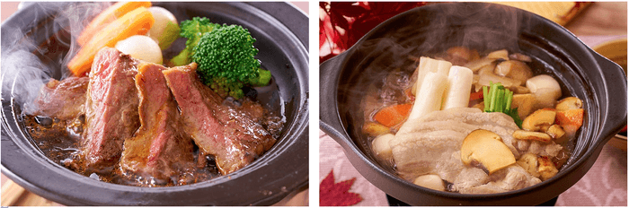 左:サーロインステーキは一人用の陶板で焼き上げて召し上がってください。(ステーキは調味牛脂を注入した加工肉です。)