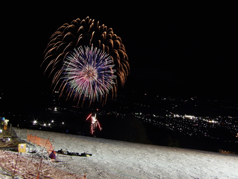 いなわしろ雪花火開催 磐梯山と「共演」ゲレンデ雪花火