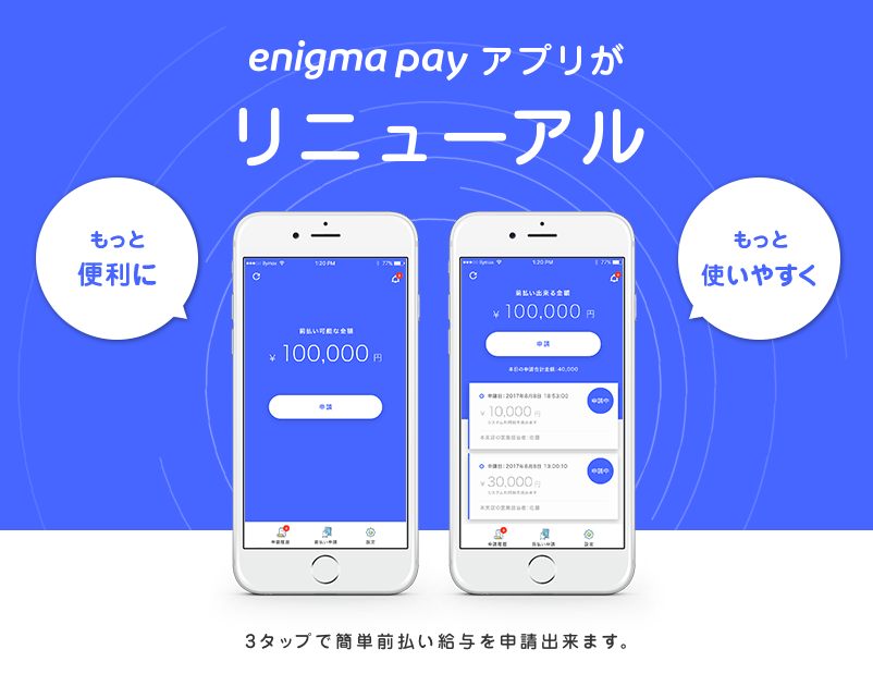 株式会社enigma(本社:東京都新宿区、代表取締役 CEO:臼井 哲也/代表取締役 COO:小口 敦士、以下「エニグマ」)が運営する前払給与サービス『enigma pay』はiOS & Android版アプリのデザインを2017年12月1日(金)にリニューアルいたしました。これにより、ご利用頂いている全てのユーザーにとって快適な前払い給与申請を可能にします。