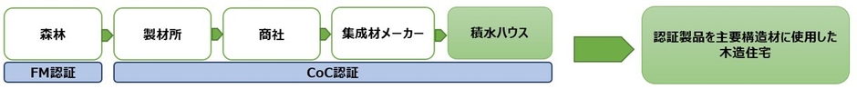 従来、このプロセスが連続していなかったため、認証製品としての木造住宅の供給はできませんでしたが、当社が前工程の流通・加工業者にも積極的に働きかけ、当社自身もCoC認証を取得したことにより、認証製品を主要構造材に使用した木造住宅を、供給する準備が整いました。