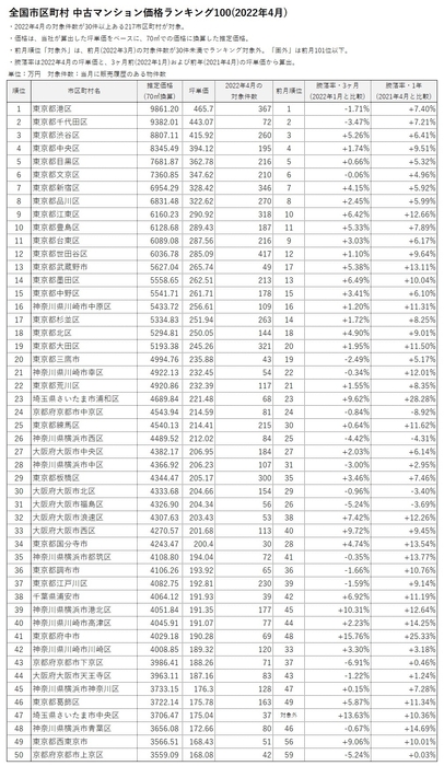 「不動産×WEB×ビッグデータ」の領域で、さまざまな不動産テックサービスを展開する株式会社ワンノブアカインド(本社:東京都港区、代表取締役社長:川島 直也、以下当社)は、当社が運営するマンション情報サイト「マンションレビュー」の保有データを元に、2022年4月の全国市区町村における中古マンションの相場を調査。坪単価をベースに70平方メートルでの価格に換算した「中古マンション価格」*1および1年前と比較した価格の上昇率を表す「騰落率」のランキング100、首都圏など主要エリアにおける中古マンション価格の相場推移について発表いたします。