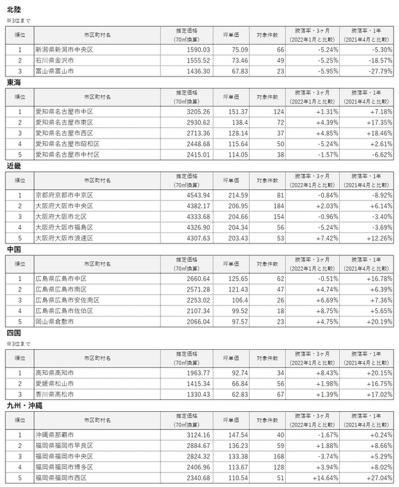 ・推定価格が100位以内の市区で、前年(2021年4月)と比較して価格が上昇したのは94市区。また、3ヶ月前(2022年1月)と比較して価格が上昇したのは65市区。