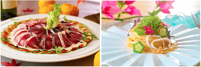 右:「イカとオクラの梅肉カッペリーニ」。クセの無いイカとオクラをさっぱりとした梅肉ソースがまとめる和風パスタ。別名<髪の毛>とも呼ばれるとても細いパスタ、カッペリーニを使用しているので、暑い夏にもつるつるっと召し上がっていただけます。