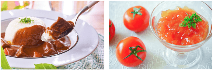 右:地元・松島トマトを使ったゼリー。凝縮された甘みを最大限に活かした、目にも涼し気でヘルシーな夏ならではのデザートです。