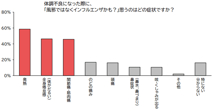 インフルエンザでは、風邪で一般的な症状(鼻水やのどの痛み)よりも先に、急激な発熱や関節痛などの全身症状が現れることが特徴です。調査でも、「風邪ではなくインフルエンザかも?」と思う症状として、発熱や全身倦怠感、関節痛・筋肉痛を挙げる人が多く見られました。