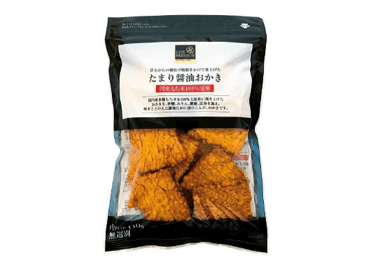 国内産水稲もち米を主原料に、砂糖・みりん・鰹節・昆布を加えた醤油たれに漬けこんだおかき。