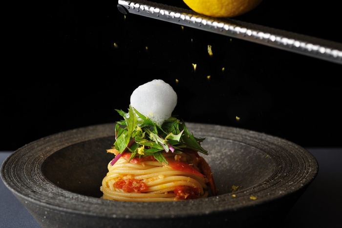 パスタ「煮貝と赤水菜のスパゲッティーニ 柚子の香り」