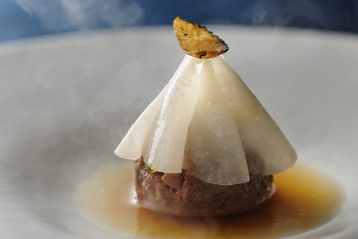 冬に脂が乗る鹿肉と旬を迎える蕪を合わせ、ジュニパーベリー(*2)などのスパイスが香るポルペッティに仕立てました。鹿肉の骨から取った出汁の旨味を凝縮したスープで煮込むことで、鹿肉の旨味と蕪の甘味を引き立てます。添えたトリュフの香りがアクセントとなる一品です。