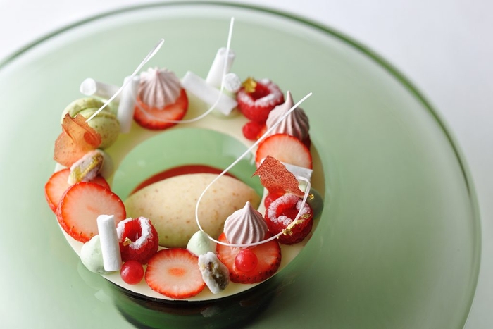 クリスマスリースをイメージしたドルチェです。トーストしたパネットーネ(*6)、レモンカードとマスカルポーネのエスプーマに、ピスタチオのパンナコッタを合わせました。ホワイトチョコレートのリースの上に、ビーツのメレンゲやイチゴ、木苺をトッピングしたクリスマスらしい華やかな見た目も楽しめます。