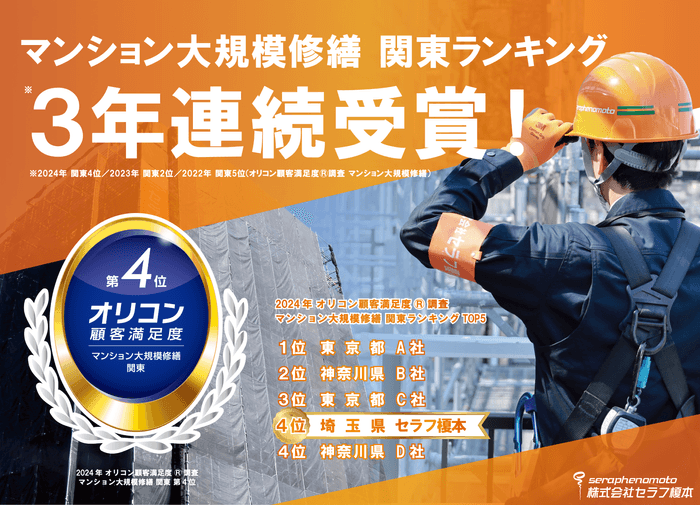 マンション大規模修繕工事を主軸とする株式会社セラフ榎本(所在地:埼玉県川口市、代表取締役:榎本 修、以下「当社」という)は、株式会社oricon MEが発表した2024年 オリコン顧客満足度(R)調査 マンション大規模修繕 関東ランキングにて第4位を獲得いたしました。